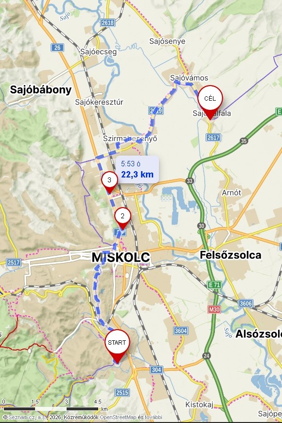 2026.04.22, szerda. Görömböly – Sajópálfala; 22,3 km, 120 m szintemelkedés (a térkép linkje telepített mapy.com esetében nyitható meg).